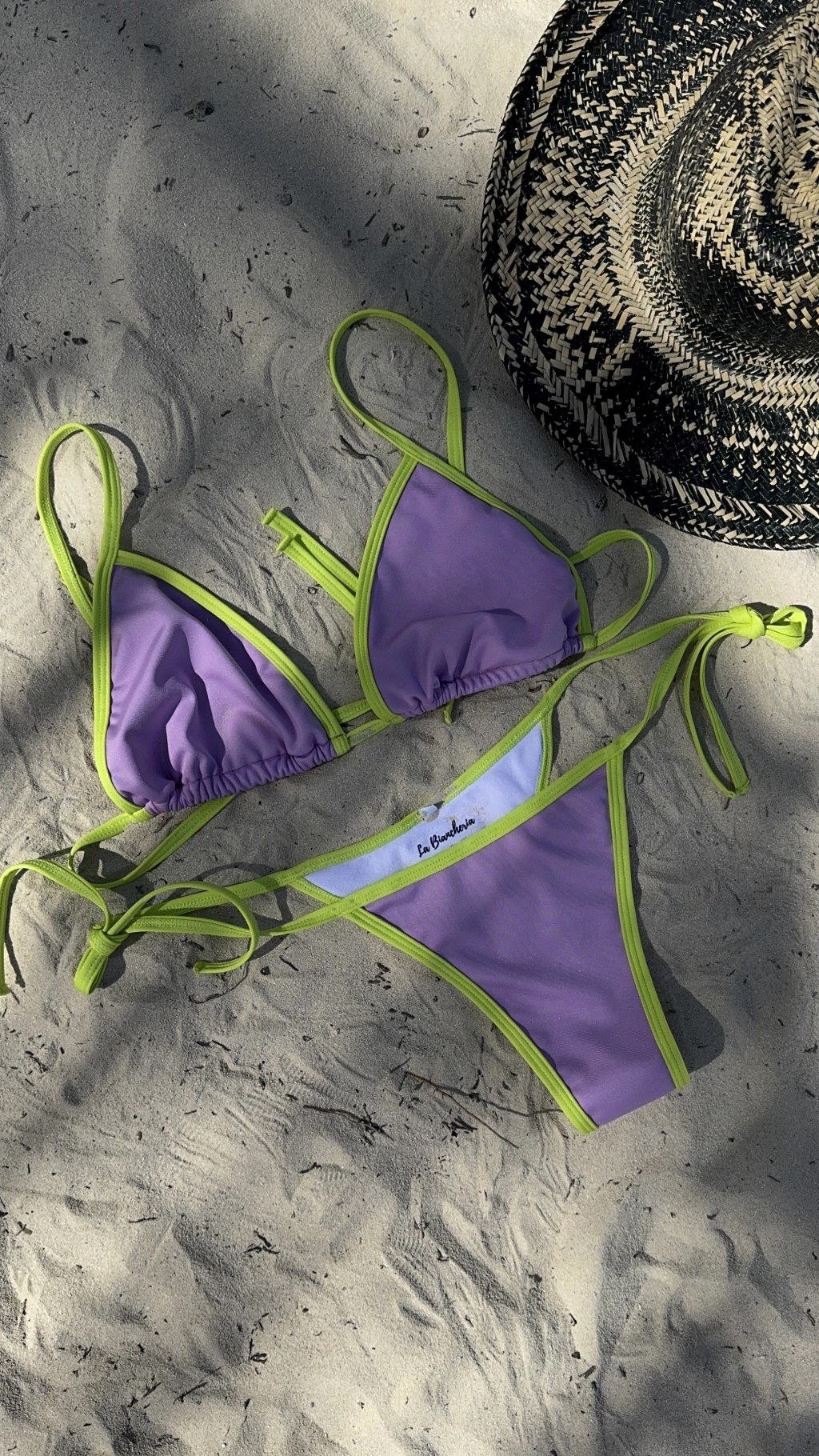 Corpiño triangulo combinado con tiras para atar. Doble forrería con bolsillito para colocar relleno.