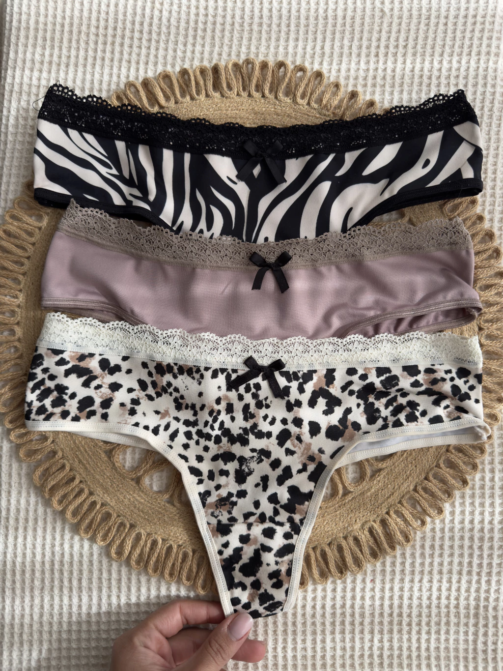 Incluye 3 bombachas culote less de lycra con detalle de puntilla en bordes y con refuerzo en zona íntima.
