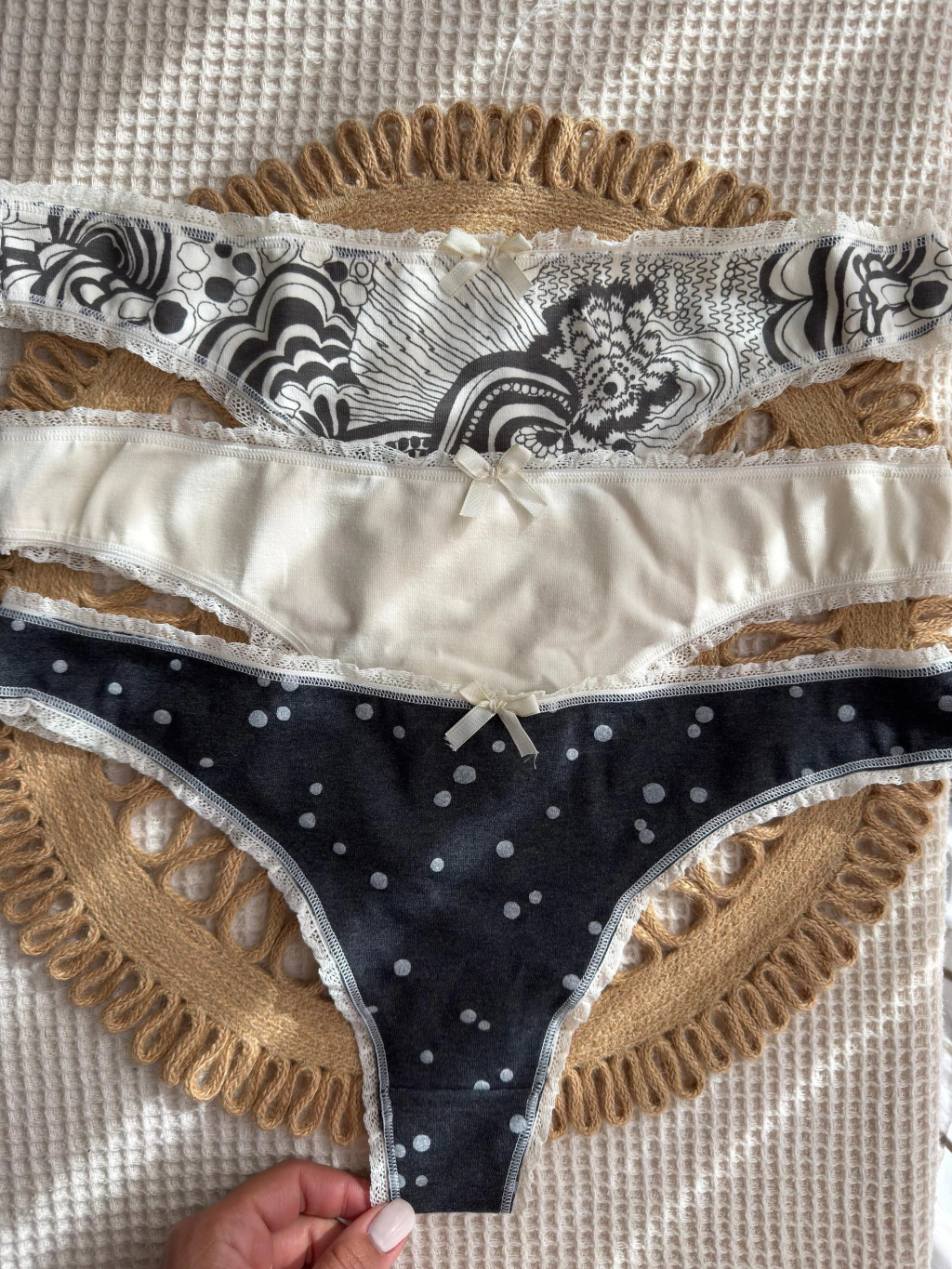 Incluye 3 bombachas colaless de algodoón con detalle de puntilla en los bordes y con refuerzo en zona íntima.