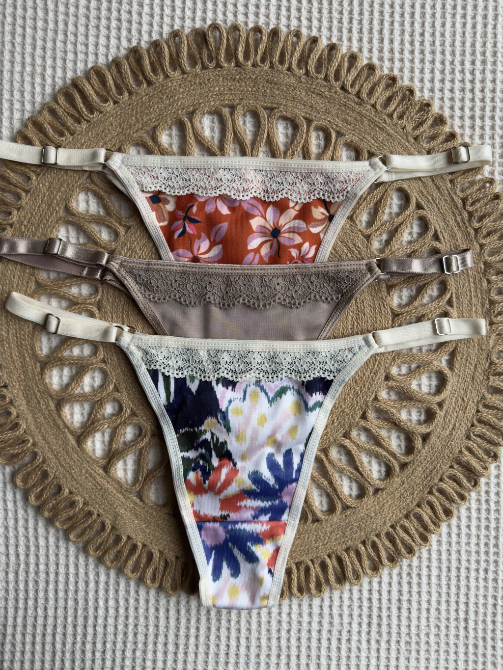 Incluye 3 bombachas colaless regulables de microfibra con puntilla en los bordes y con refuerzo de algodon en zona íntima.