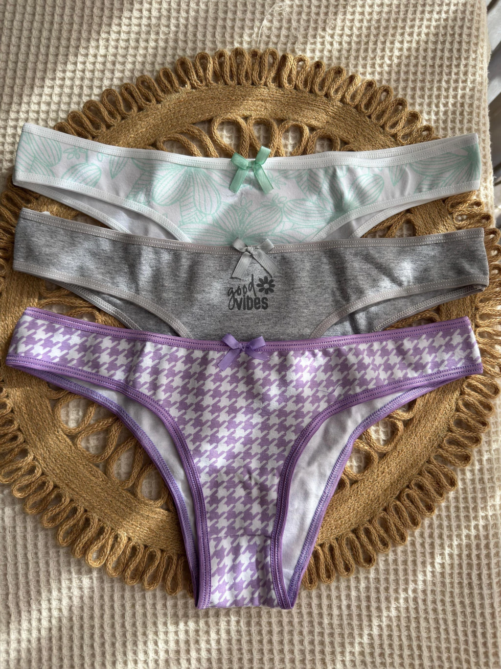 Incluye 3 bombachas vedetinas de algodón con detalle de puntilla en bordes y con refuerzo en zona íntima.